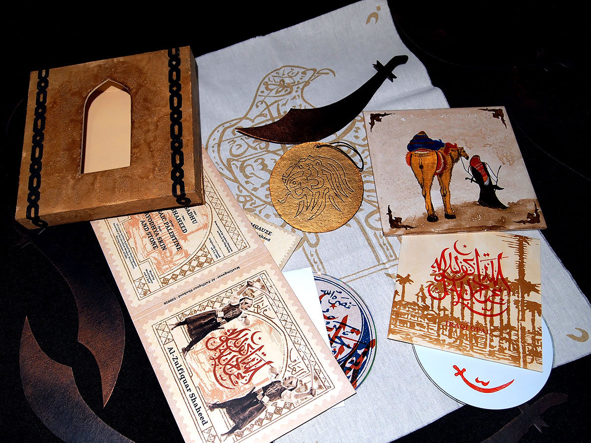 Handcrafted art edition strictly limited to 119 hand-numbered copies. Multi-layered textured die-cut boxset housing the standard CD edition above, a hand-painted real antique tile, screenprinted cotton cloth, hand-carved golden medallion, faux copper-tinted arabian sword, plus a bonus disc. Each piece is unique, meticulously crafted one by one.